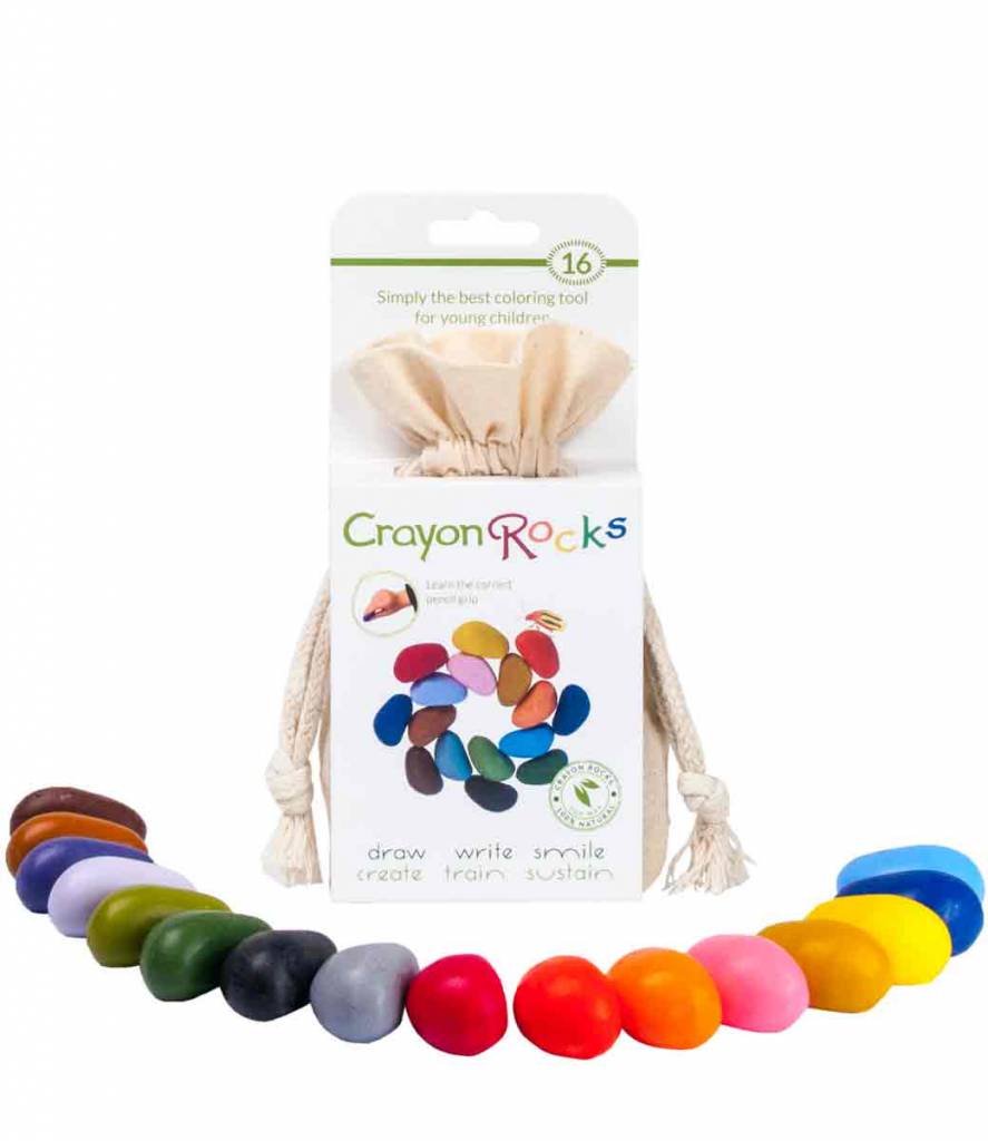 Crayon Rocks son lápices de colores a base de cera de soja natural cultivada en EE.UU. y coloreadas con pigmentos minerales naturales. Los colores son brillantes y se pueden superponer para hacer dibujos maravillosos. No tóxicos y una mejor opción a los lápices de cera tradicionales fabricados a partir de derivados del petróleo. No se parten y han sido diseñados para que los niños, sin darse cuenta, los cojan utilizando los dedos de forma correcta, fortaleciendo los músculos de agarre y así preparar los dedos y las manos para la escritura a mano. Su forma permite tanto colorear de forma fina como en trazos grandes y anchos para crear imágenes ricas en color. No manchan la ropa ni las manos y son aptos para diestros y para zurdos. Utilizado por los terapeutas ocupacionales para desarrollar la motricidad fina. ¡Dibujar, Escribir, Sonreír!