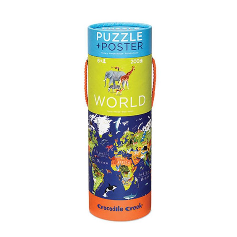 Puzle presentado en una caja cilíndrica con 200 piezas que incluye un póster del Mundo para guiarte (y guiarle) a la hora de montarlo.